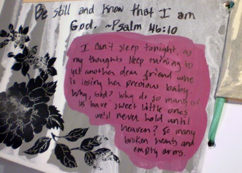 Sadly, a couple days after returning from my mountaintop experience, (it took me that long to get back into the loop online), I learned that a dear friend was going through the loss of her baby. Having been there myself almost 4 years ago, it broke my heart to see her in that same place. I couldn't sleep that night, after learning about her loss, so I did what I now had the ability to do - I got up, and while I prayed, I also expressed my angst in my new art journal. She loved the page as much as I do.